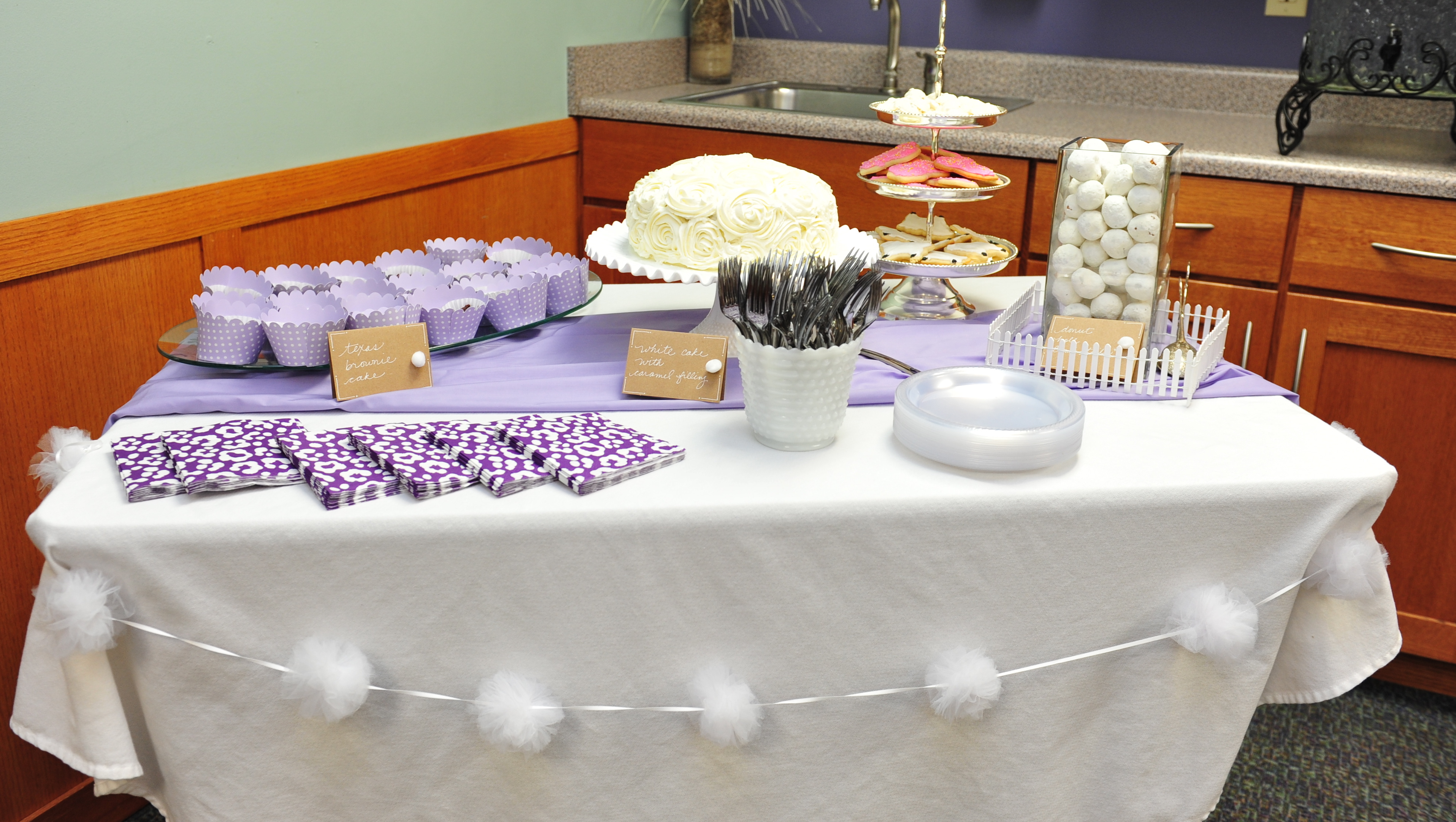 Dessert featured a delicious white cake with a caramel chocolate filling, with piped buttercream frosting to resemble lambs’ tails. We also served brownie sheet cake (Laura’s special request), powdered sugar donut holes (also lambs’ tails) and lamb and onesie sugar cookies.
